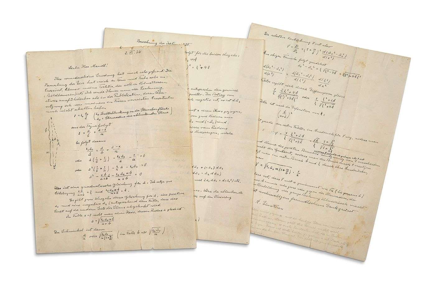 Importante lettre scientifique, avec calculs et équations, sur la théorie de la lentille gravitationnelle et la déviation de la lumière dans le champ gravitationnel. C’est en 1936 que Rudi W. MANDL, jeune tchécoslovaque réfugié aux États-Unis, où il gagnait sa vie comme plongeur dans un restaurant, a contacté Einstein pour lui suggérer que la gravité déforme la lumière comme une lentille. Ce sera le début d’un surprenant échange scientifique, dont Einstein tirera la matière de son article « Lens-Like Action of a Star by the Deviation of Light in the Gravitational Field » (Science, 1936), où il rend hommage au rôle de Mandl. Einstein remercie d’abord Mandl de l’envoi d’œufs peints qui ont intéressé sa fille sculptrice (Bildhauerin). Puis il livre, avec force calculs et équations, et un graphique en marge, ses secondes réflexions sur la lentille gravitationnelle, en réponse à de nouveaux arguments de Mandl à l’appui de sa théorie. Partant de son graphique, il pose une équation avec la déviation de la lumière à la surface de l’étoile, et le rayon stellaire de l’étoile déviatrice : «Σo Lichtablenkung an der Sternoberfläche Δo Sternradius des ablenkenden Sterns » Ce qui donne une équation quadratique… Au terme de ses calculs, Einstein conclut que b doit toujours être très grand devant les rayons des étoiles, sinon la formation d’ombres rendrait tout le calcul illusoire…