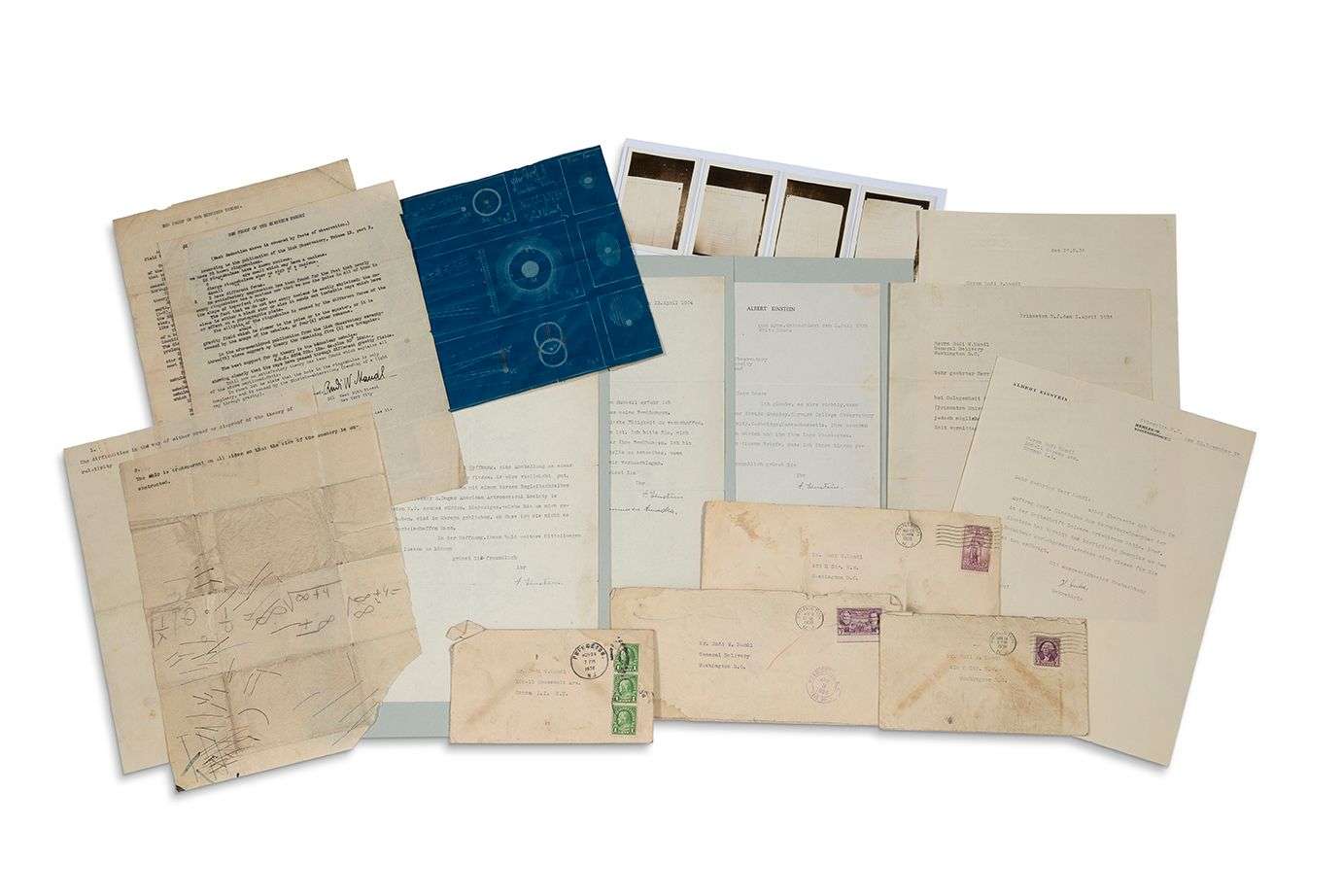 Princeton 13 avril 1934 (Beer est à Londres) Il a appris de son collègue Russell, à son grand regret, que ses efforts afin d’obtenir pour Beer un travail astronomique en Amérique n’ont pas été couronnés de succès. Qu’il le tienne au courant de ses démarches. Il est prêt à écrire n’importe où en sa faveur. Old Lyme (Connecticut) 3 juillet 1935 (Beer est au Solar Physics Observatory de Cambridge). Il lui conseille d’envoyer ses travaux les plus récents au professeur Howard Shapley, Harvard College Observatory, Harvard University, et de lui expliquer sa situation. On joint un tapuscrit signé de Rudi W. MANDL, New Proof of the Einstein Theory (2 p. in-4, note autographe d’Einstein au verso), avec diagramme tiré en bleu, plus 2 notes dactyl. | et 3 L.S. d’Helen DUKAS, la secretaire d’Einstein, Princeton 1934-1936, à Rudi Mandl (enveloppes)