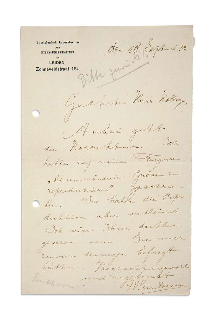L.A.S. «W. Einthoven », Leiden 18 septembre 1912, à un collègue | 1 page in-8 à en-tête Physiologisch Laboratorium der Rijks-Universiteit te Leiden (trous de classeur) | en allemand.