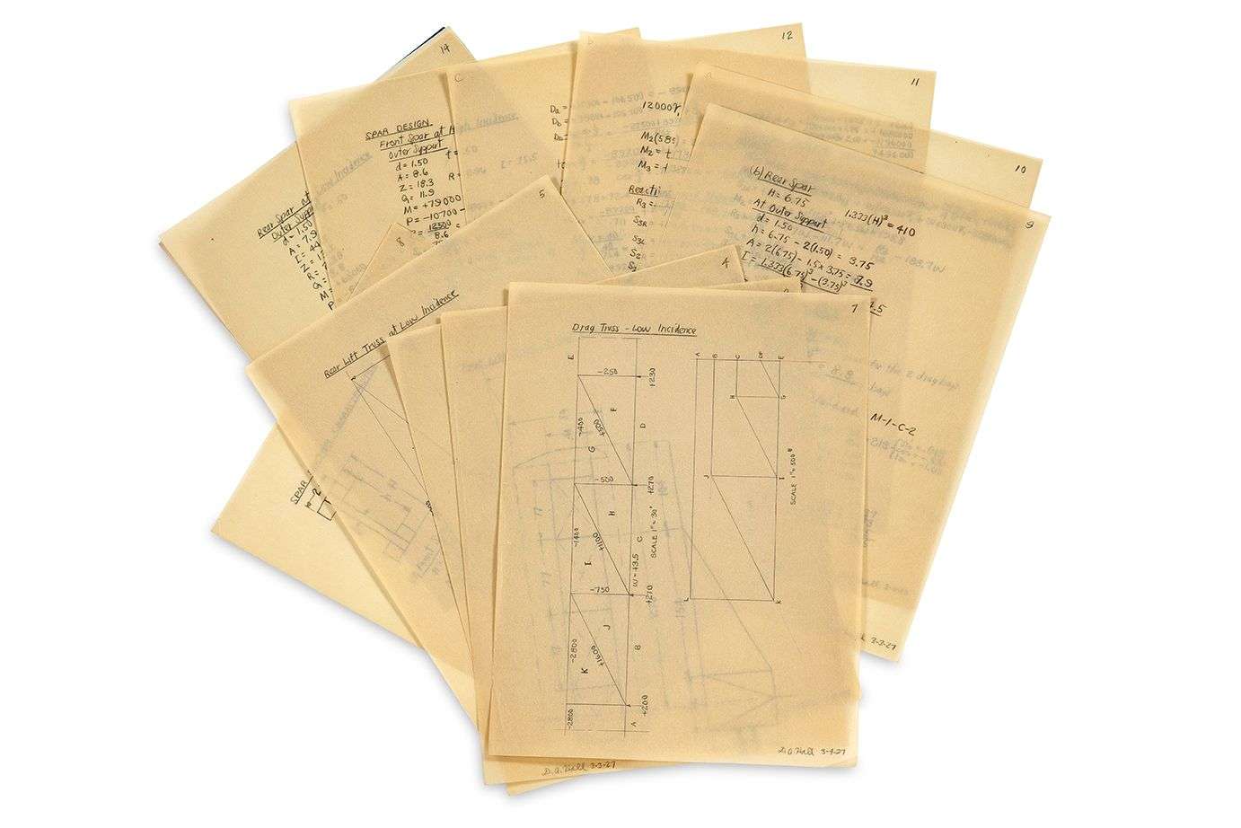 – des notes préliminaires (4 p. manuscrites) signées « D. A. Hall », 24 et 25 février 1927, intitulées «M-I for NYP [New York-Paris] Study-Preliminary », et 2 p. dactylographiées avec notes manuscrites de Hall. Ces notes préli - minaires abordent différents points techniques relatifs à la conception d’un nouveau modèle d’avion adapté aux exigences techniques de la traversée de l’Atlantique, sur la base du modèle existant Ryan M-2. – dessins d’une aile (12 p. manuscrites signées « D. A. Hall »), 3 et 4 mars 1927, comprenant un ensemble de dessins relatifs notamment aux réservoirs de gaz qui devaient être insérés dans l’aile, et des tableaux de calculs intégrant des variables liées aux points de levage des ailes, à leur résistance et à la conception du longeron, pièce principale intégrant la structure de ces dernières.