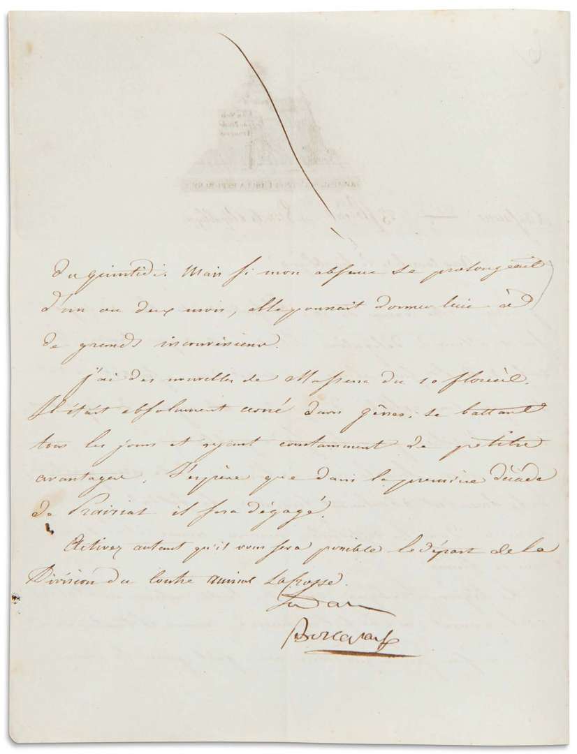 Il est constant que toutes les caisses de Dép[artemen]ts sont pleines | il serait donc essentiel de s'occuper sans relâche d'empêcher cet argent de séjourner, et de l'utiliser pour le service public. J'ai passé hier la revue de l'armée. Toute cette partie de la Suisse est absolument française. Le soldat est accueilli dans les différentes maisons, comme il le serait dans la sienne. La légion Italique va filer tout entière en Italie, où le général en chef [Berthier] l'organisera comme il l'entendra. [...] si mon absence se prolongeait d'un ou deux mois, elle pourrait donner lieu à de grands inconvéniens. J'ai des nouvelles de MASSENA du 10 floréal. Il était absolument cerné dans Gênes, se battant tous les jours et ayant constamment de petits avantages. J'espère que dans la première décade de Prairial ».