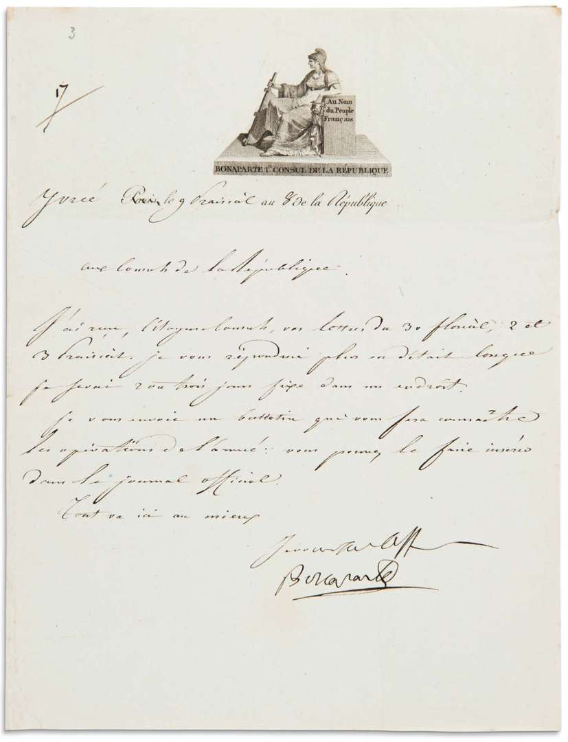 3 L.S. « Bonaparte », Yvrée 7 et 9 prairial VIII [27 et 29 mai 1800], « aux Consuls de la République » CAMBACÉRÈS et LEBRUN | les lettres sont écrites par Bourrienne | 1 page in-4 chaque, vignettes gravées au nom de Bonaparte Ier Consul de la Republique. [16, 17, 18]