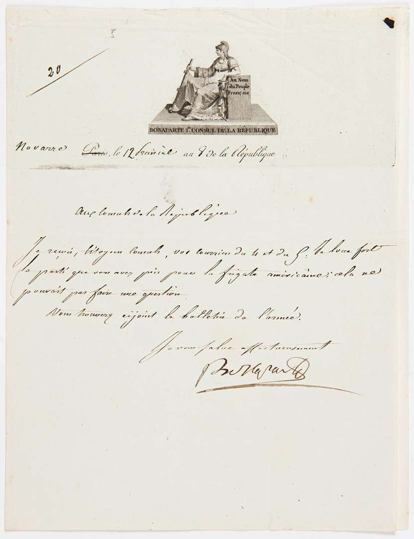 L.S. « Bonaparte », Novarre 12 prairial VIII [1er juin 1800], « aux Consuls de la République » CAMBACÉRÈS et LEBRUN | la lettre est écrite par Bourrienne | ¾ page in-4, vignette gravée au nom de Bonaparte Ier Consul de la Republique. [20] « Je reçois, Citoyens Consuls, vos courriers du 4 et du 5. Je loue fort le parti que vous avez pris pour la frégate américaine | cela ne pouvait pas faire une question. Vous trouverez ci-joint le bulletin de l'armée »...