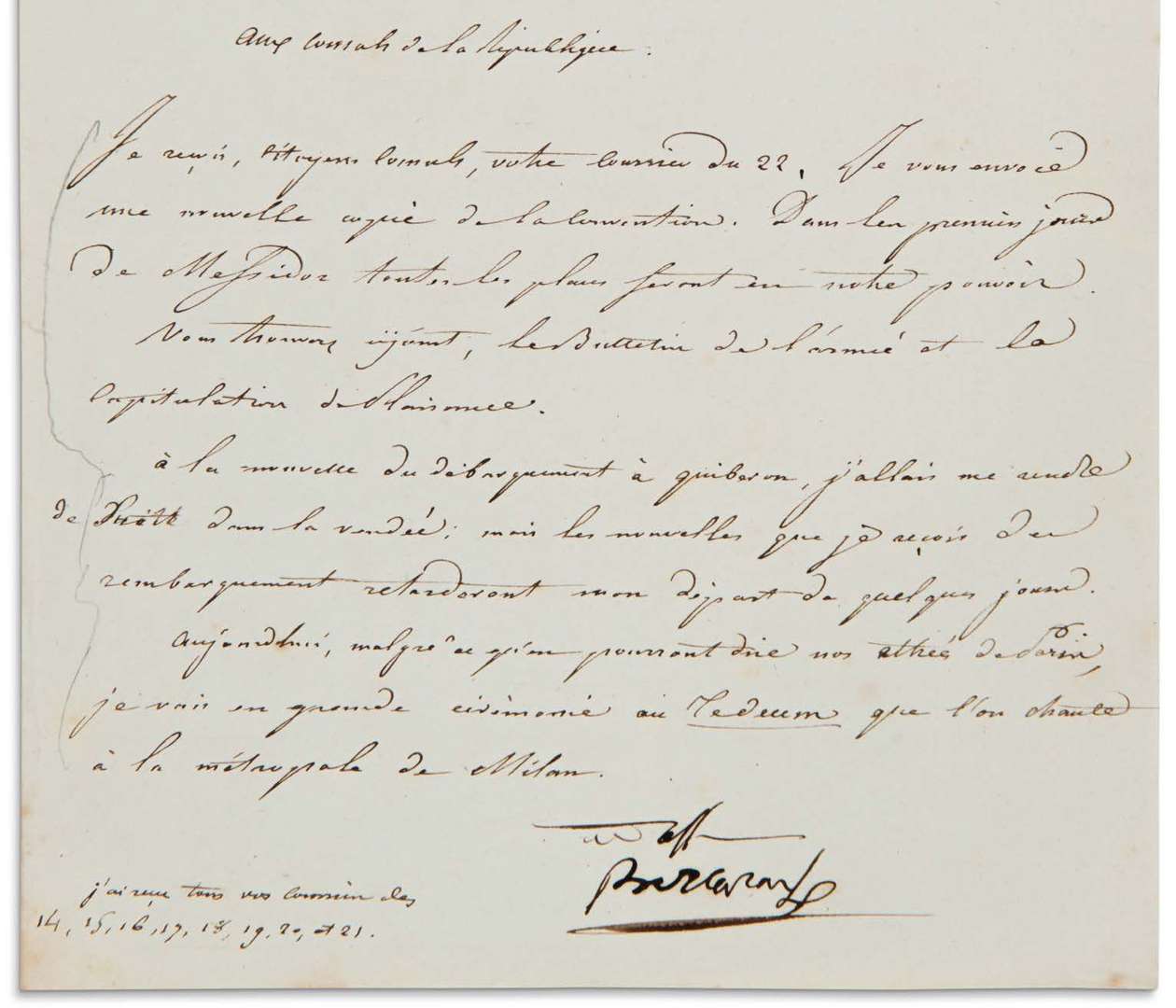 2 L.S. « Bonaparte », Torre de Garafola [Torre Garofoli] 26-27 prairial VIII [15-16 juin 1800], « aux Consuls de la République » CAMBACÉRÈS et LEBRUN | les lettres sont écrites par Bourrienne | 1 page in-4 chaque, vignettes gravées au nom de Bonaparte Ier Consul de la Republique.