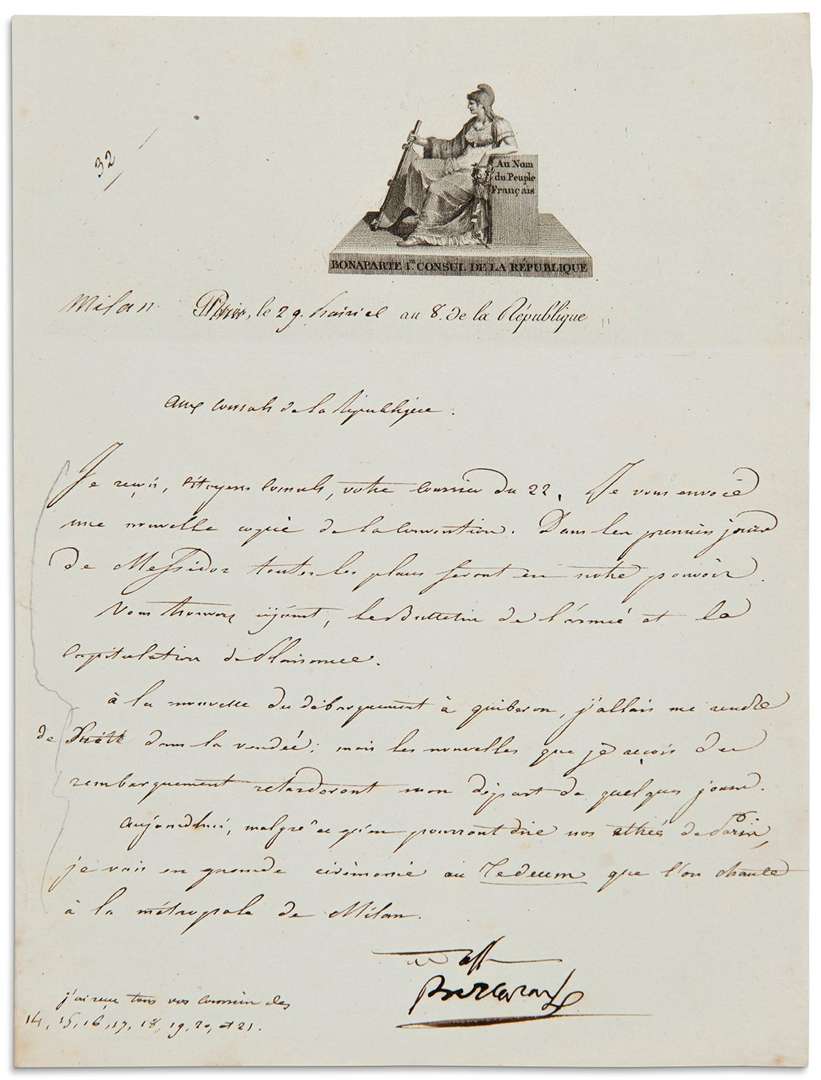 3 L.S. « Bonaparte » (la 1re avec apostille autographe), Milan 29 prairial-2 messidor VIII [18-21 juin 1800], « aux Consuls de la République » CAMBACÉRÈS et LEBRUN | les lettres sont écrites par Bourrienne | 1 et 1 pages et demi-page in-4, vignettes gravées au nom de Bonaparte Ier Consul de la Republique. [32, 33, 34] 29 prairial. Il leur envoie « une nouvelle copie de la convention [convention d'armistice]. Dans les premiers jours de Messidor toutes les places seront en notre pouvoir ». Il envoie aussi « le Bulletin de l'armée et la capitulation de