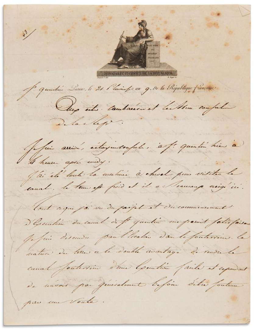 L.S. avec un mot autographe « affectueusement Bonaparte », Saint-Quentin 21 pluviôse IX [10 février 1801], aux Consuls à CAMBACÉRÈS et LEBRUN | la lettre est écrite par Bourrienne | 2 pages in-4, vignette gravée au nom de Bonaparte Ier Consul de la Republique (rousseurs). [43]