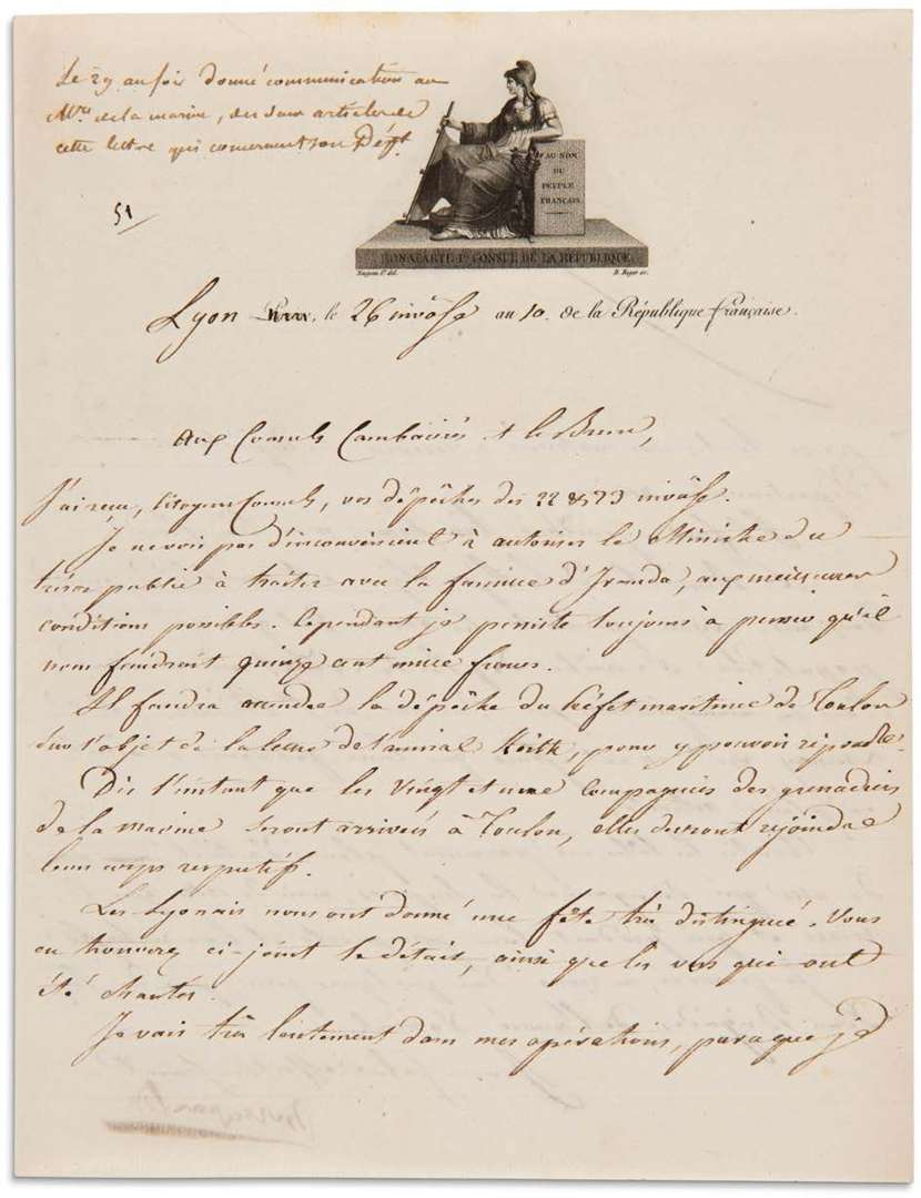 3 L.S. « Bonaparte », Lyon 24-27 nivôse X [14-17 janvier 1802], aux Consuls CAMBACÉRÈS et LEBRUN | les lettres sont écrites par Bourrienne | 2 et 3 pages in-4, vignettes gravées au nom de Bonaparte Ier Consul de la Republique. [50, 51, 52] 24 nivose. « Il fait ici un froid excessif et je passe les matinées depuis midi jusqu'à six heures à recevoir les Préfets et les notables des départements voisins. Vous savez que, dans ces sortes de conférences il faut parler longtems. Ce soir, la ville de Lyon donne un concert et un bal. Je vais y aller dans une heure. Les travaux de la Consulte avancent. Les troupes de l'armée d'Orient arrivent à force à Lyon. Je prends des mesures pour les faire habiller. Je compte les passer en revue le 28. Je continue à être extrêmement content de tout ce que je vois, soit du peuple de Lyon, soit du midi de la France. Les négociations d'Amiens me paraissent avancer.