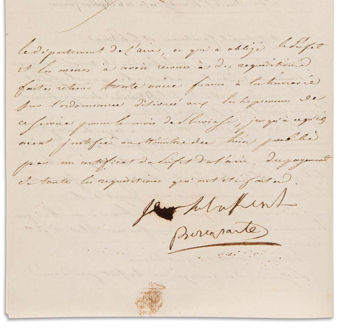 3 L.S. « Bonaparte » (la 1re avec compliment autographe), Lyon 1er et 2 pluviôse X [21 et 22 janvier 1802], aux Consuls CAMBACÉRÈS et LEBRUN | les lettres sont écrites par Bourrienne | 2 et 3 pages in-4, vignettes gravées au nom de Bonaparte Ier Consul de la Republique. [56 , 57, 58] 1er pluviose. Il ne faut pas laisser séjourner à Brest la flotte Batave. Portez une grande attention à ce que les vingt mauvais membres du Tribunat soient ôtés. Vous pouvez assurer très positivement que tant que des hommes tels que Thiesse, Chazal, Chénier, Garat seront au Tribunat, je ne présenterai aucun projet de loi ». Il a assisté « au bal que le commerce a donné à ma femme ». Il se plaint du service des fourrages dans le département de l'Ain...Il ajoute de sa main : « Salut affectueux ».