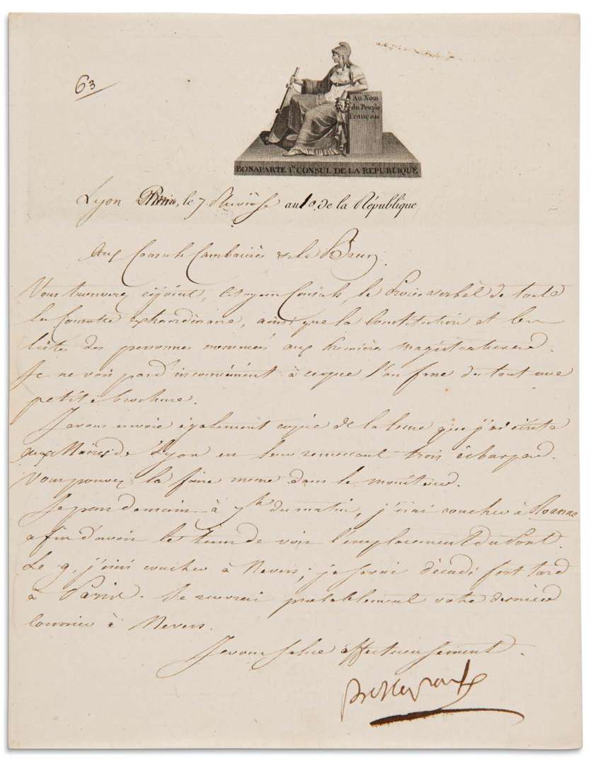 Consul Cambacérès, Nevers 10 pluviôse « à une heure du matin » [64] : « Le 1er consul me charge de vous écrire qu'il couche cette nuit à Nevers | il en partira aujourd'huy à sept heures du matin et il espère être à Paris demain de très grand matin »... (1 page in-4).