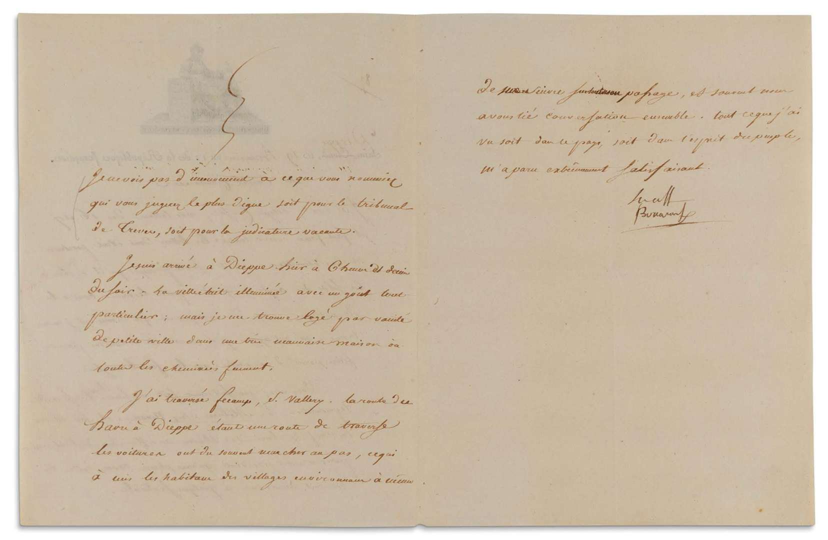 Trèves, soit pour la judicature vacante. Je suis arrivé à Dieppe hier à 6 heures et demie du soir. La ville était illuminée avec un goût tout particulier | mais je me trouve logé par vanité de petite ville dans une très mauvaise maison où toutes les cheminées fument. J'ai traversé Fécamp, S. Vallery. La route du Havre à Dieppe étant une route de traverse les voitures ont dû souvent marcher au pas, ce qui a mis les habitans des villages environnans à même de me suivre sur mon passage, et souvent nous avons lié conversation ensemble. Tout ce que j'ai vu soit dans ce pays, soit dans l'esprit du peuple, m'a paru extrêmement satisfaisant ».