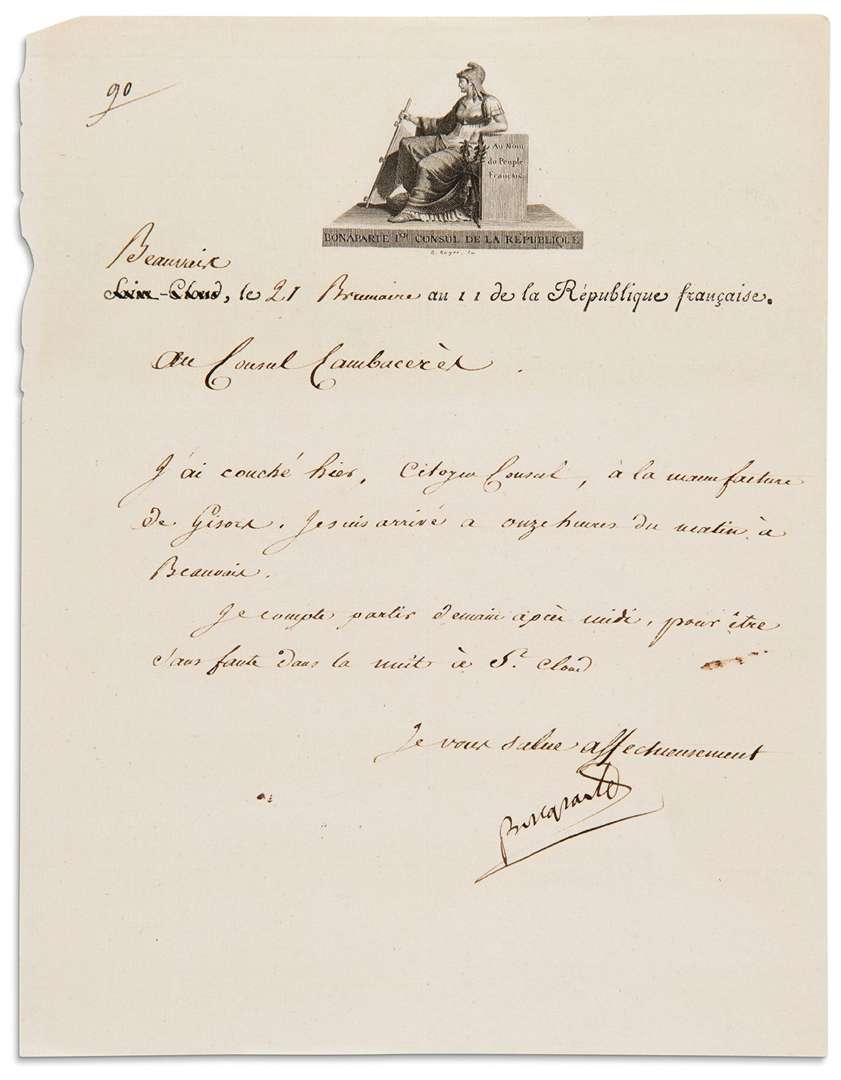 CAMBACÉRÈS | les lettres sont écrites par Méneval | 1 page et demi-page in-4, vignettes gravées au nom de Bonaparte