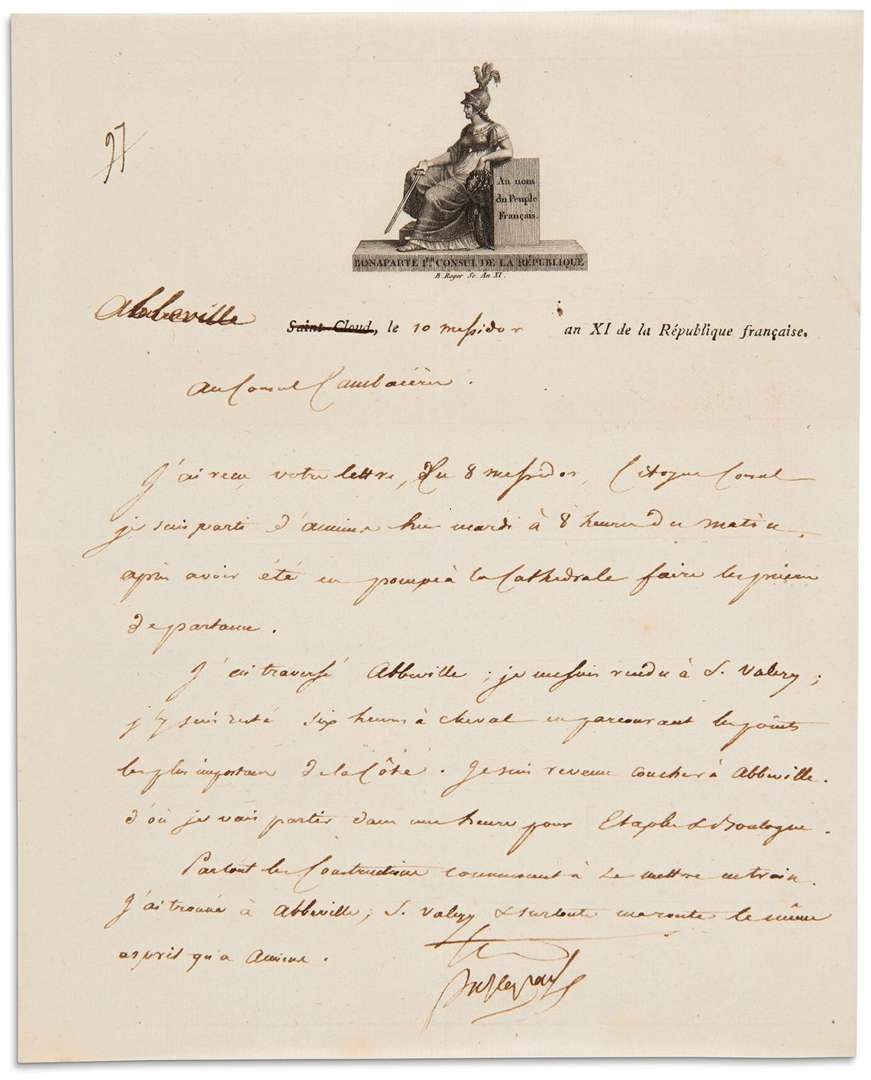 L.S. « Bonaparte » avec compliment autographe, Abbeville 10 messidor XI [29 juin 1803], au Consul CAMBACÉRÈS | la lettre est écrite par Méneval | 1 page in-4, vignette gravée au nom de Bonaparte Ier Consul de la Republique. [97]