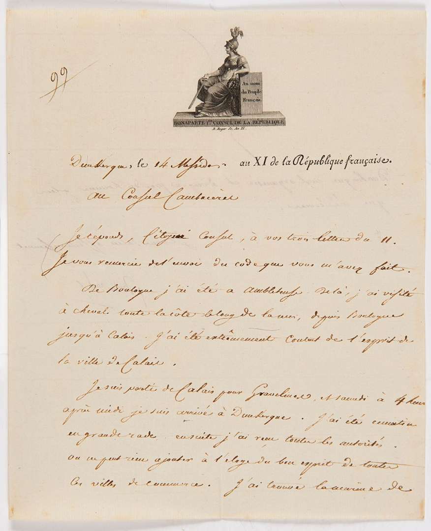 3 L.S. « Bonaparte », Dunkerque 14 et 16 messidor XI (3 et 5 juillet 1803), au Consul CAMBACÉRÈS | les lettres sont écrites par Méneval | 1 page in-4 chaque (la 1re i page et quart), vignettes gravées au nom de Bonaparte Ier Consul de la Republique. [99 à 101] 14 messidor. Il le remercie de l'envoi du Code civil. « De Boulogne j'ai été à Ambleteuse. De là, j'ai visité à cheval toute la côte le long de la mer, depuis Boulogne jusqu'à Calais. J'ai été extrêmement content de l'esprit de la ville de Calais. Je suis parti de Calais pour Gravelines, et samedi à 4 heures après midi je suis arrivé à Dunkerque. J'ai été ce matin en grande rade ensuite j'ai reçu toutes les autorités. On ne peut rien ajouter à l'éloge du bon esprit de toutes ces villes de commerce. J'ai trouvé la marine à Dunkerque mal organisée et dirigée par des hommes plus que médiocres »...