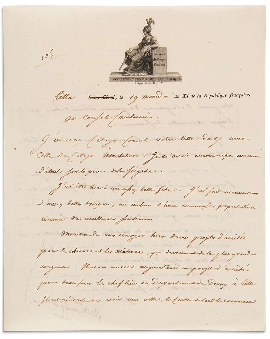 2 L.S. « Bonaparte », Lille 19 et 20 messidor XI (8 et 9 juillet 1803), au Consul CAMBACÉRÈS | les lettres sont écrites par Méneval | 2 pages et 1 page in-4, vignettes gravées au nom de Bonaparte