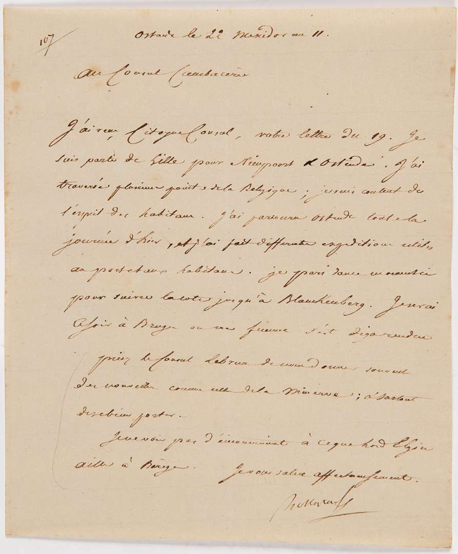 L.S. « Bonaparte », Ostende 22 messidor XI (11 juillet 1803), au Consul CAMBACÉRÈS | la lettre est écrite par Méneval | 1 page in-4.[107]