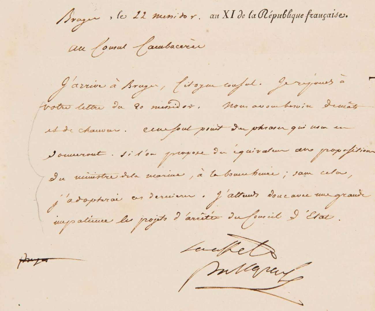 3 L.S. « Bonaparte », dont une avec compliment autographe, Bruges 22-25 messidor XI (11-14 juillet 1803), au Consul