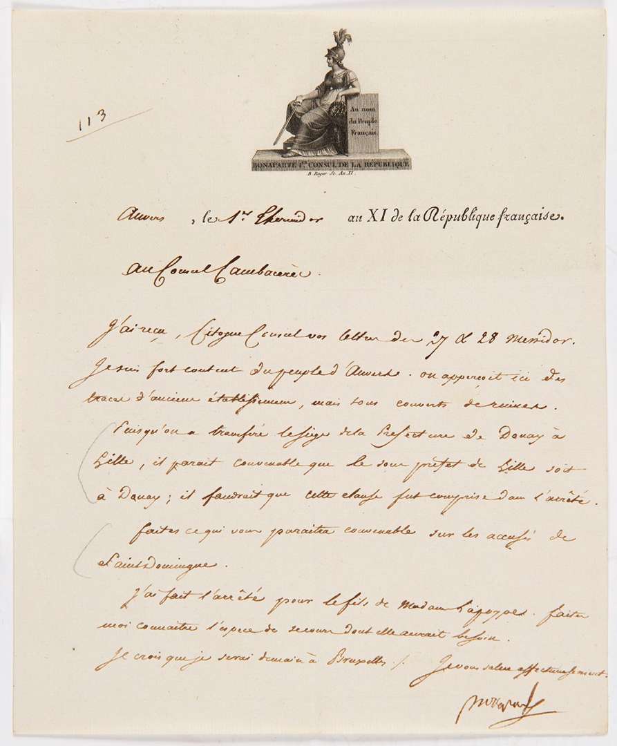 L.S. « Bonaparte », Anvers 1er thermidor XI (20 juillet 1803), au Consul CAMBACÉRÈS | la lettre est écrite par Méneval | 1 page in-4, vignette gravée au nom de Bonaparte Ier Consul de la Republique. [113]