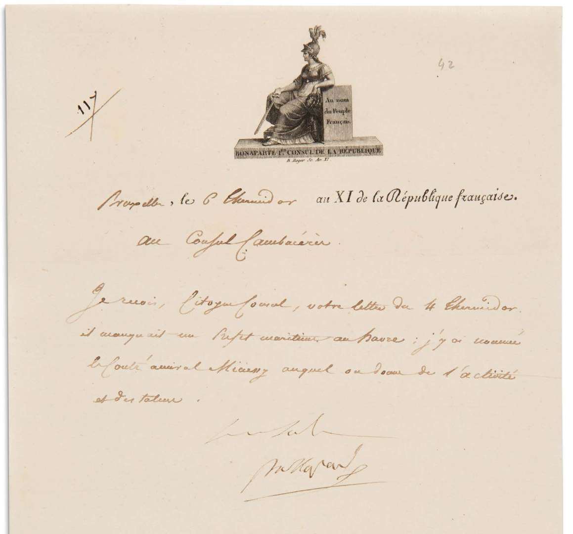 CAMBACÉRÈS | les lettres sont écrites par Méneval | 2 pages et demie, 1 page et quart,1 page et demie, une demi-page, 1 page et demie, 1 et 1 pages in-4, vignettes gravées au nom de Bonaparte Ier Consul de la Republique. [114 à 120]