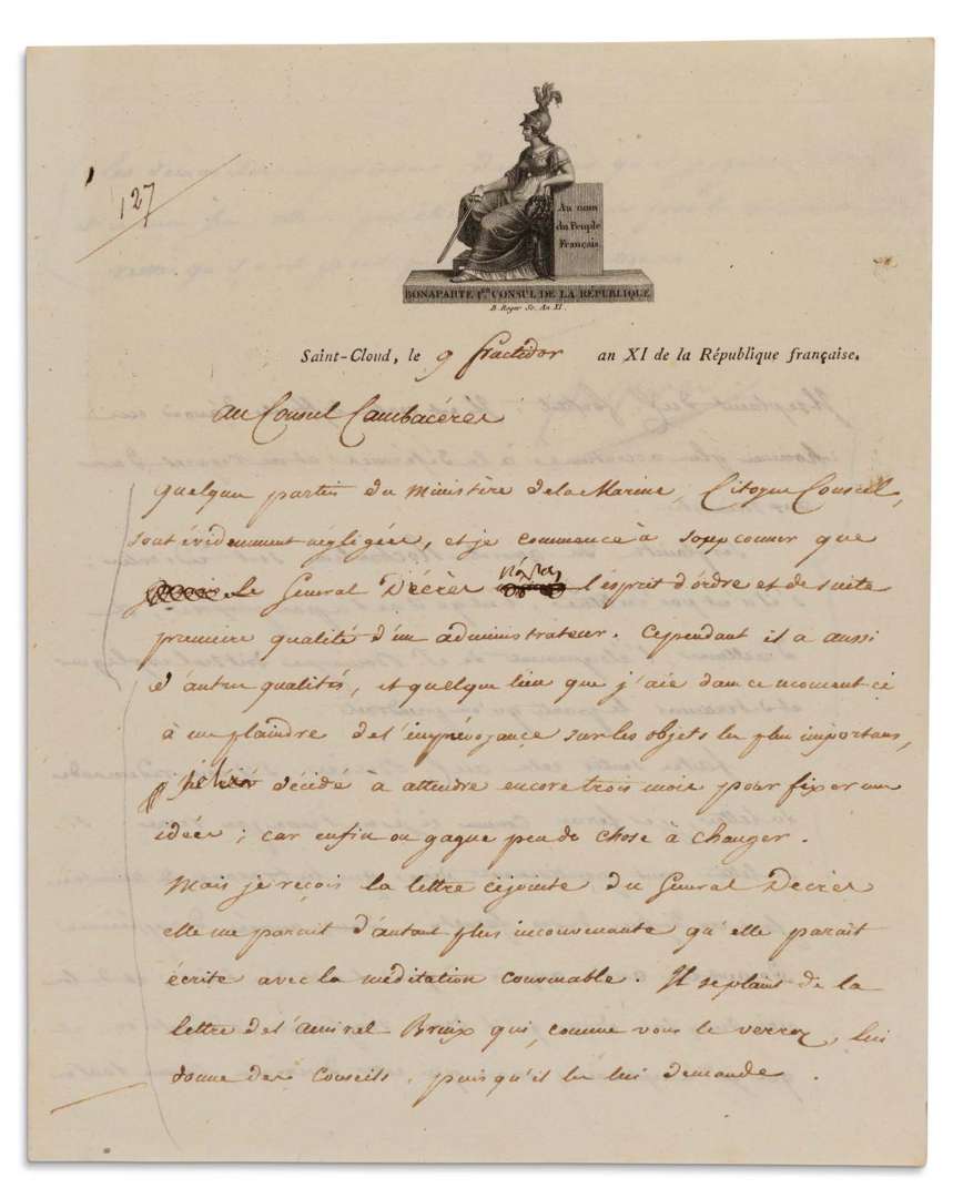 L.S. « Bonaparte » avec corrections autographes, Saint-Cloud 9 fructidor XI (27 août 1803), au Consul CAMBACÉRÈS | la lettre est écrite par Méneval | 2 pages et demie in-4, vignette gravée au nom de Bonaparte Ier Consul de la Republique. [127]