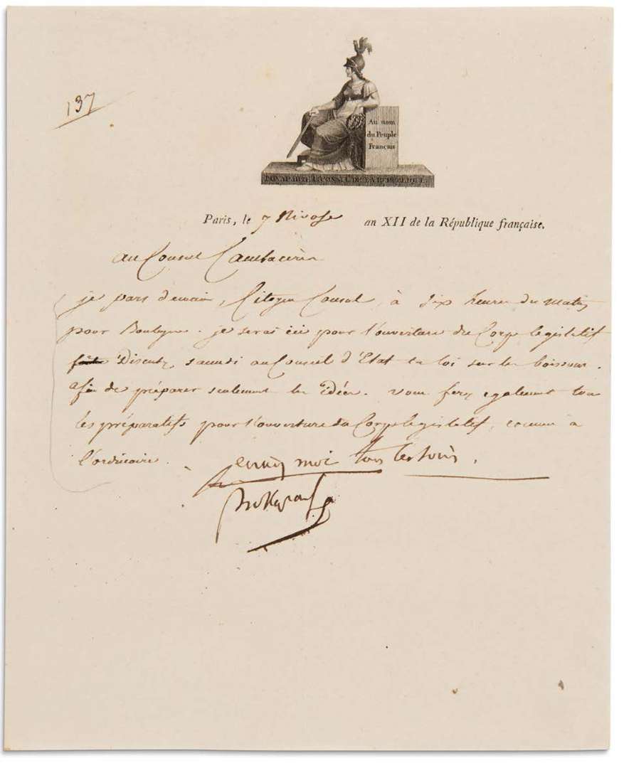 Paris 7 nivose. « Je pars demain, citoyen Consul, à six heures du matin pour Boulogne. Je serai ici po l'ouverture du Corps législatif »...Il ajoute de sa main : « écrivez moi tous les soirs ».