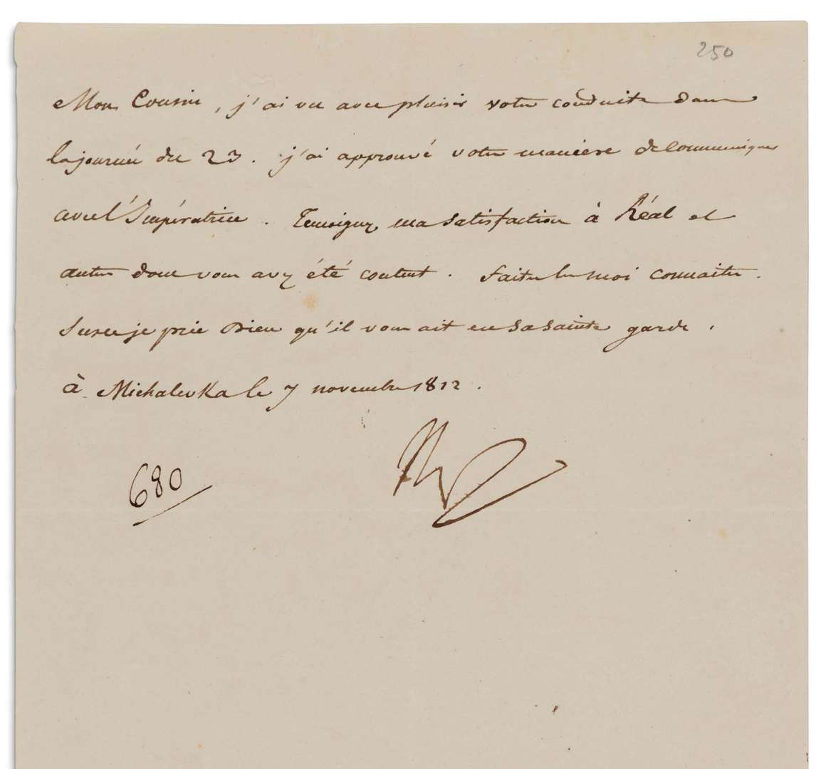 « Mon Cousin, j'ai vu avec plaisir votre conduite dans la journée du 23. J'ai approuvé votre manière de communiquer avec l'Impératrice. Témoignez ma satisfaction à Réal et autres dont vous avez été content. Faites les moi connaître »...