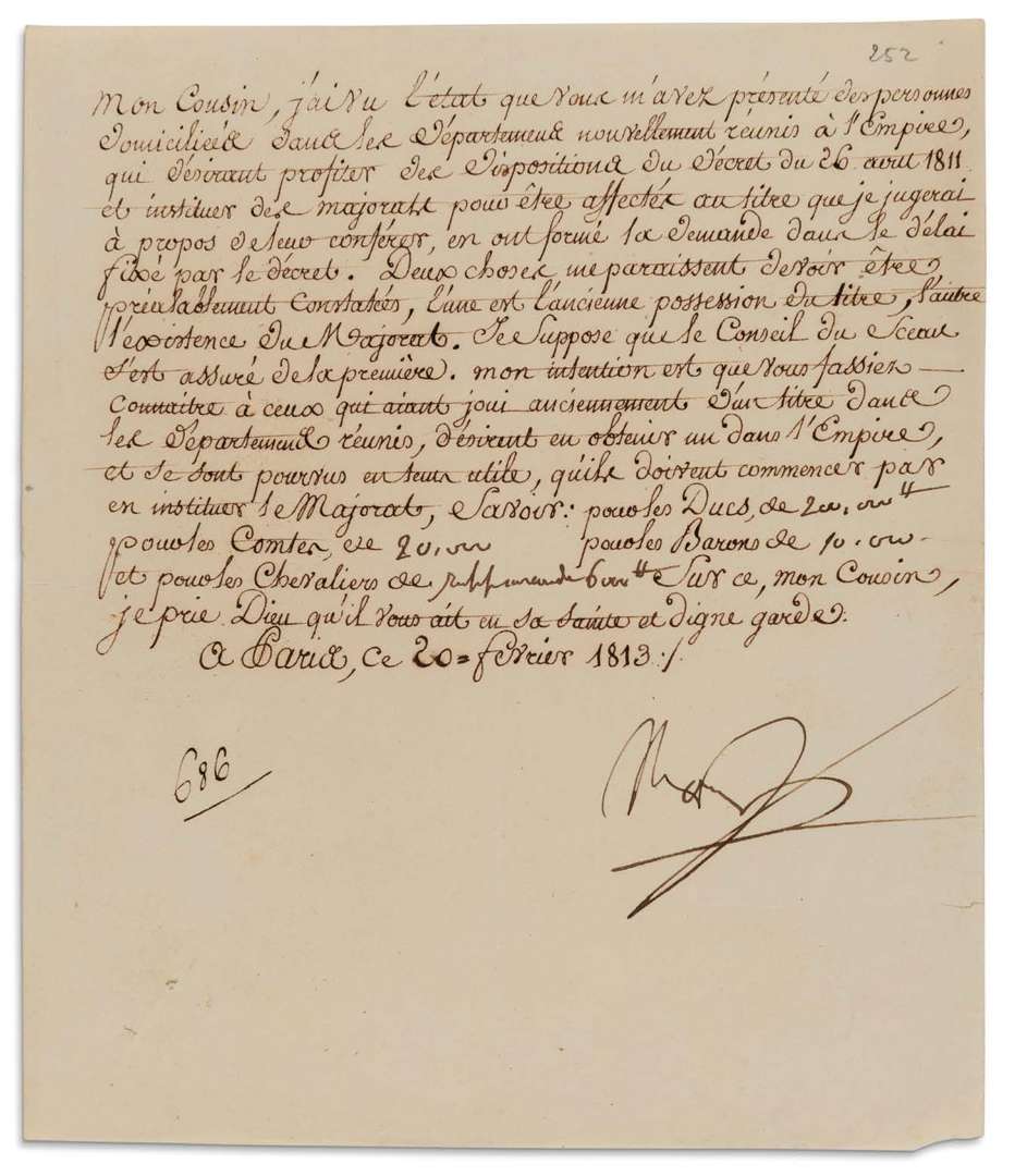Paris 20 fevrier. « Mon Cousin, j'ai vu l'état que vous m'avez présenté des personnes domiciliées dans les départemens nouvellement réunis à l'Empire qui désirant profiter des dispositions du décret du 26 août 1811 et instituer des majorats pour être affectés au titre que je jugerai à propos de leur conférer, en ont formé la demande [...] Deux choses me paraissent devoir être préalablement constatées, l'une est l'ancienne possession du titre, l'autre l'existence du Majorat. Je suppose que le