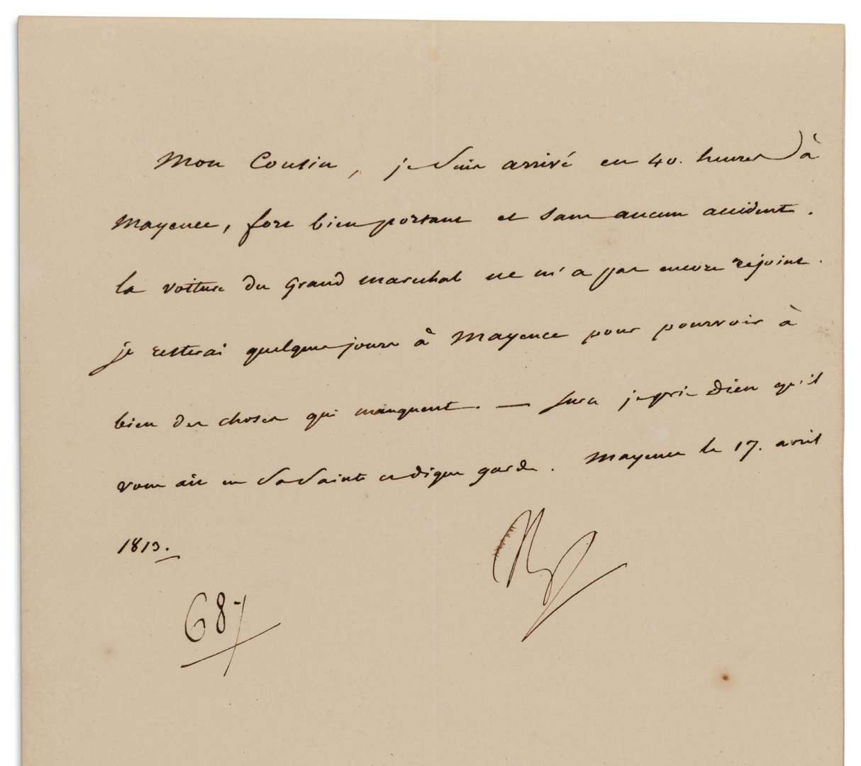 Mayence 17 avril. « Mon Cousin, je suis arrivé en 40 heures à Mayence, fort bien portant et sans aucun accident. La voiture du Grand maréchal [Duroc] ne m'a pas encore rejoint. Je resterai quelques jours à Mayence pour pourvoir à bien des choses qui manquent »...