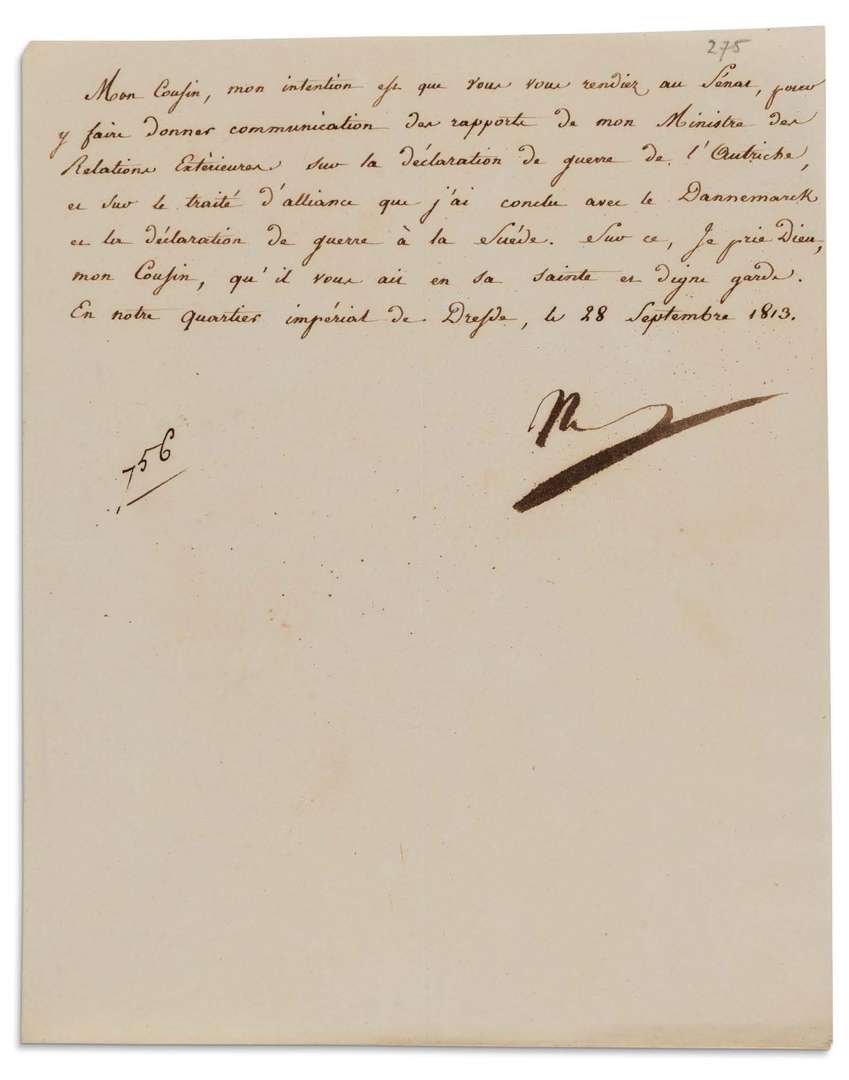 Dresde 27 aout au soir. « Mon Cousin, je suis tellement fatigué et tellement occupé que je ne peux pas vous écrire longuement. Le Duc de Bassano s'en charge. Les affaires vont ici fort bien »...