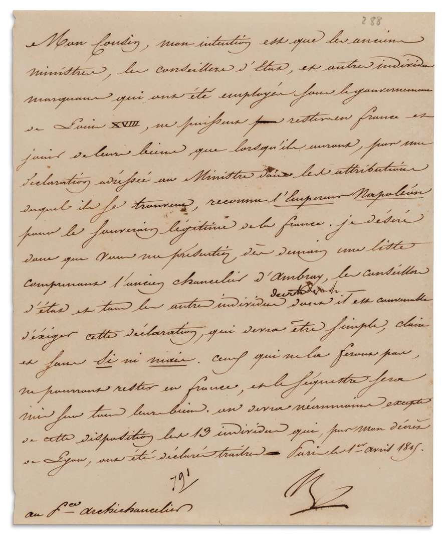 Dambray, les conseillers d'État et tous les autres individus [addition autographe :] de votre departement dont il est convenable d'exiger cette déclaration, qui devra être simple, claire et sans si ni mais. Ceux qui ne la feront pas, ne pourront rester en France, et le séquestre sera mis sur tous leurs biens. On devra néanmoins excepter de cette disposition les 13 individus qui, par mon décret de Lyon, ont été déclaré traîtres »... 8 avril. « J'ai vu avec étonnement que dans le Bulletin des loix, la formule n'est plus celle-ci : Napoleon par la grace de Dieu et les Constitutions de l'Empire, Empereur des Francais. On ne met plus que : Napoleon