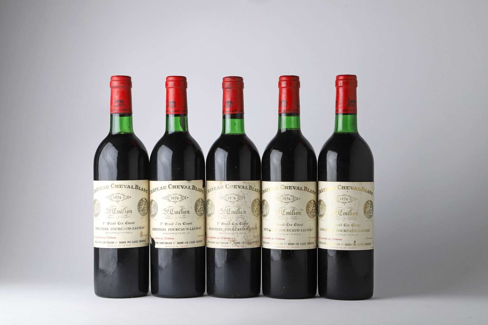 5 B CHÂTEAU CHEVAL BLANC (1 B.G| 3 T.L.B|+.| 3 e.t.h. légères| 1 e.t.h. et 1 e.t.a| 1 accroc bas de capsule) - 1974 - GCC1A Saint-Emilion
