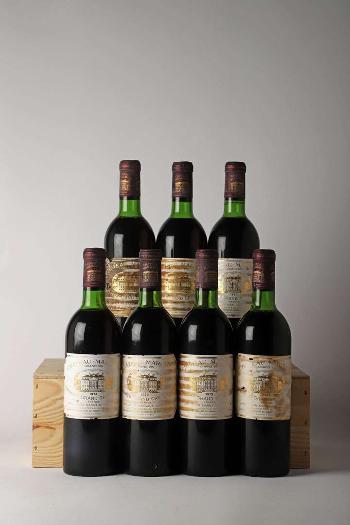7 B CHÂTEAU MARGAUX (4 T.L.B| 3 H.E.+| e.t.h. à e.t.a| 2 capsules avec 1 accroc côté| 1 c.a| bas de jupe) - 1973 - GCC1 Margaux
