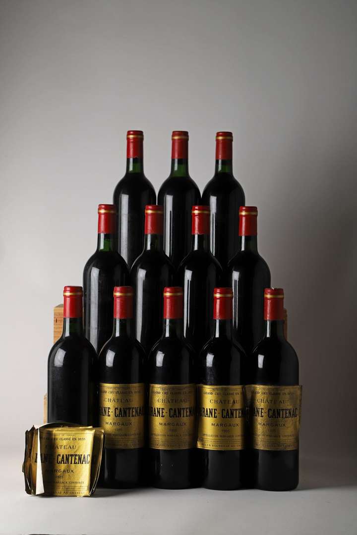 12 B CHÂTEAU BRANE-CANTENAC (Caisse Bois d'origine sans pavillon supérieur) (5 B.G| 1 B.G.-| 1 T.L.B| e.t.h. légères décollées| 2 c.c. et quelques accros bas de jupes par guillotines) - 1985 - GCC2 Margaux