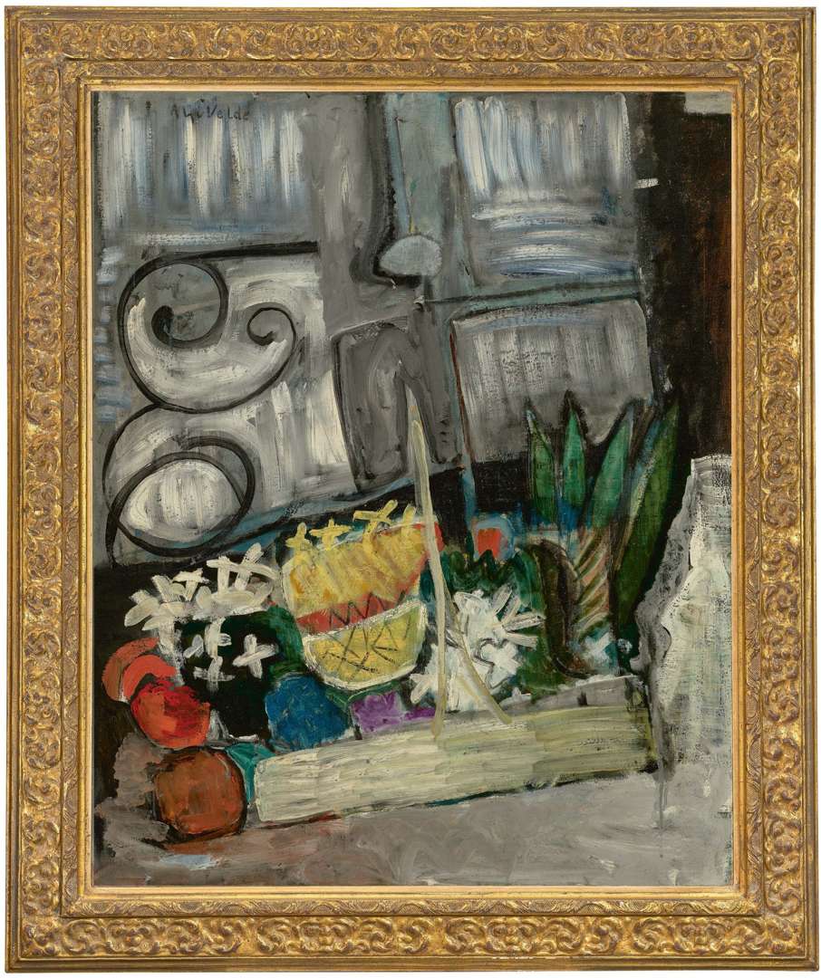 Graphisches Kabinett de Brême, où Bram van Velde exposera douze pièces, fixe le terminus ante quem (52) de ces oeuvres. Peut-être est-il loisible d'apercevoir dans la nature morte à la fenêtre et dans le bouquet à la fenêtre P. nos 37 bis et 39 les avant-coureurs thématiques et pour peu structurels, “corrigés” par Matisse, des fleurs et surtout des natures mortes qui se développeront jusqu'au départ pour la Corse, en 1930 ? Dans son article de 1929, Jan Greshoff commente ces sujets à la faveur d'oeuvres de 1927 et 1928, et reproduit sous 1929 la nature morte à la coupe de fruits P. n°55 comme “l'expression la plus forte et la plus complète de A. G. van Velde jusqu'à ce jour”. Le critique relève la récurrence du motif en volutes de la balustrade de la fenêtre, barrière symbolique entre l'artiste et la nature. La permanence de cette ferronnerie ornementale s'étend jusqu'au voyage en Corse. Les deux années qui précèdent auront vu se mettre en place une construction plus méditée (bandes verticales, registres horizontaux) à focalisation déterminée : s'accentue la dimension graphique, Bram van Velde pousse le contraste entre le blanc et le sombre, entre le fond et les couleurs à travers lesquelles les fruits se détachent (voir, hors de toute réordonnance interne, P. n°s 37, 41, 42 [note : notre tableau], 43, 46-48, 52-55). On devine qu'au cours de cette période le réel, tout d'abord pris en compte comme un système d'objets donnés dans un espace mesurable et considéré à distance (P. nos 37, 46, 48), va se transformer dans la concentration visuelle sur le motif pictural appréhendé dans un espace de moins en moins balisé (P. n° 47, 52).»