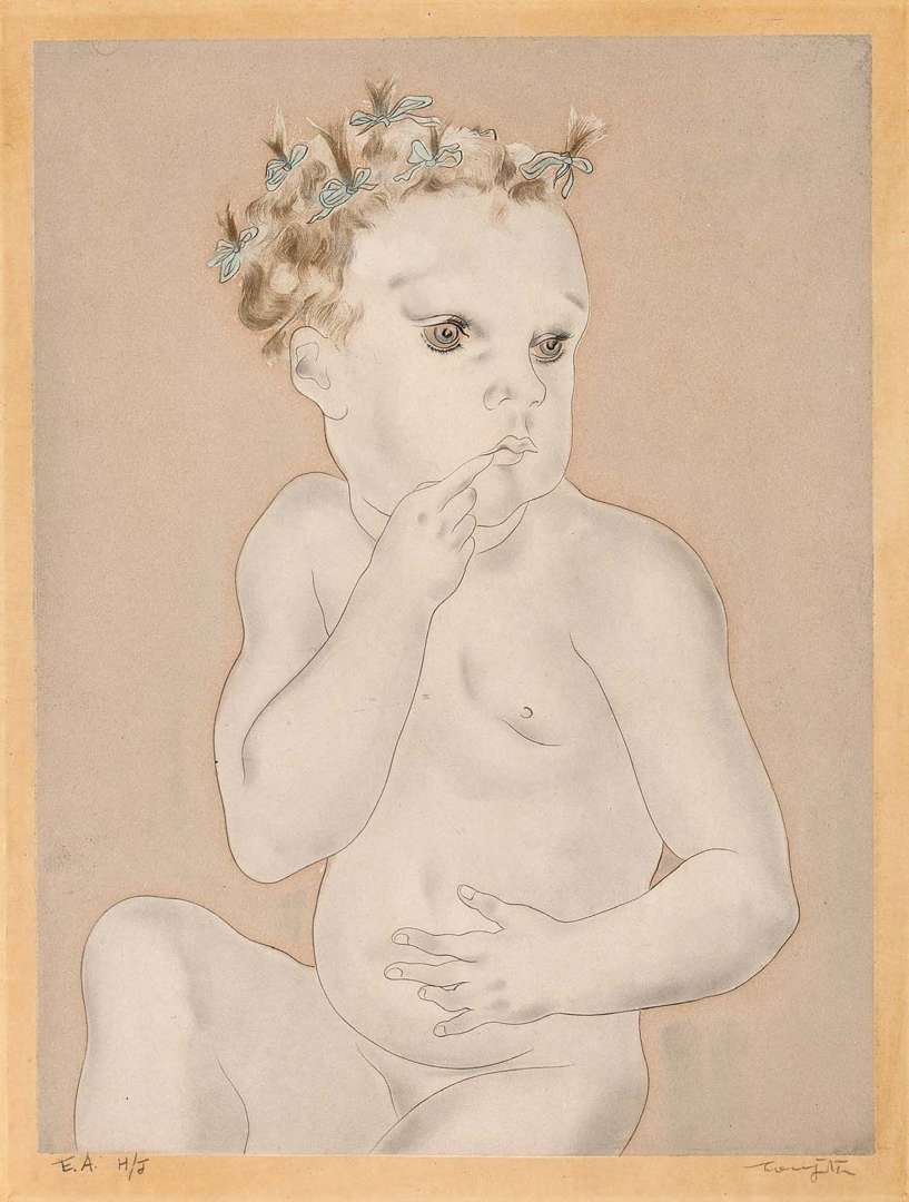 Léonard Tsuguharu Foujita (1886 - 1968), Enfant suçant son doigt, 1929, encre de Chine et lavis d'encre sur papier, signée et datée en bas à droite, 33 x 22,5 cm, in. vente, Tableaux modernes