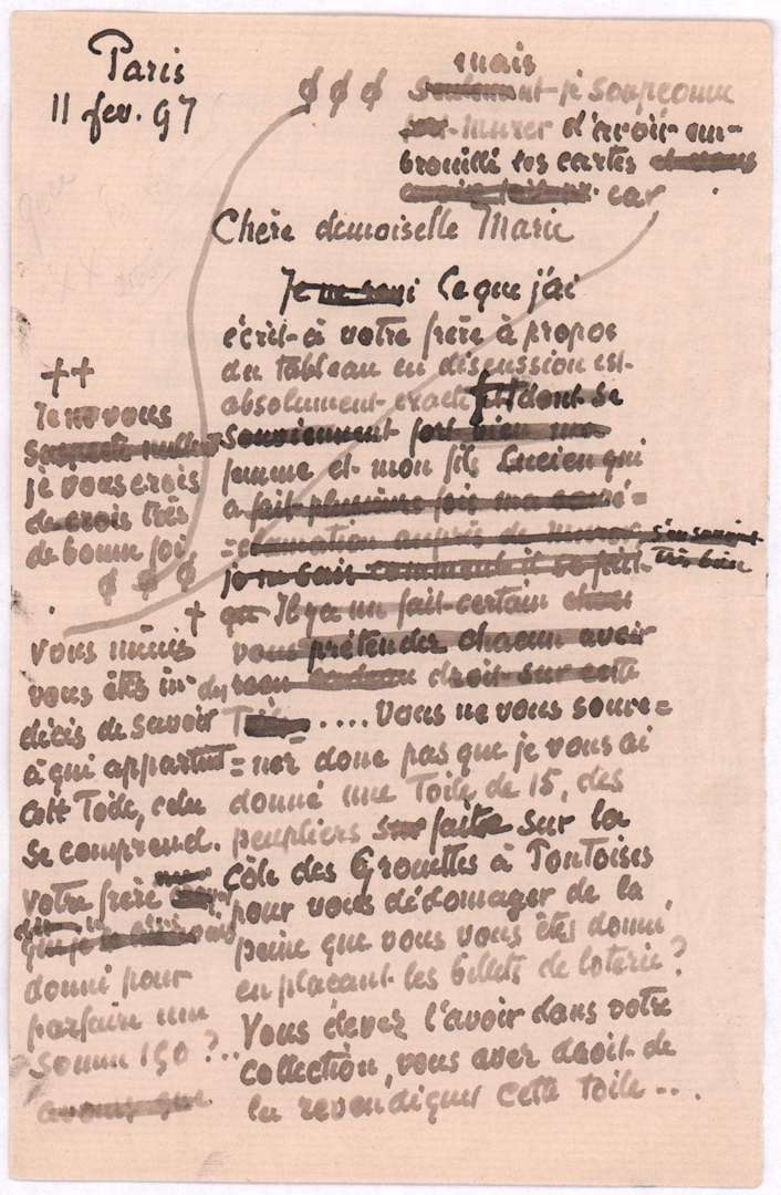 "Chère Mademoiselle Marie, ce que j'ai écrit à votre frère au sujet de la photo dont il est question est absolument vrai. Je sais que vous êtes de bonne foi, mais je soupçonne que Muret a embrouillé les choses, car vous écrivez que vous aimeriez savoir à qui appartient ce tableau | je peux comprendre cela. Votre frère a donné (?) une somme de 50. Vous ne vous souvenez donc pas que je vous ai donné une toile de taille 15, des peupliers peints sur la Côte des Grouettes à Pontoise, pour vous dédommager de la peine que vous avez eue à placer les billets de loterie. Vous devez l'avoir dans votre collection, vous êtes en droit de réclamer ce tableau... Mais je ne me souviens pas avoir vendu quoi que ce soit à Saureuil Richard, mais ce que je sais, c'est qu'il ne comprenait pas mes tableaux et qu'il me les rendait toujours. Je ne sais pas comment Muret a arrangé les choses, mais je suis sûr que les deux tableaux en question sont les miens. J'aurais hésité à accepter un tel marché, une toile de format 15 à laquelllle j'étais très attaché...non ! Autant que je me souvienne, c'est le boulanger... qui a permis de réunir la somme de 50... C'est plus logique. La petite neige fine vous a en effet été offerte par ma femme, que je me souviens, mais je ne sais pas où la retrouver. Je ne l'ai jamais vraiment aimé, il était mauvais. En compensation de tout cela, je serais heureux de faire quelque chose de différent et de mieux. Je pense que ce sera beaucoup mieux sous tous les angles. Si vous venez à Paris, vous pouvez déposer le tableau au Coutet, 34 rue Lafayette"