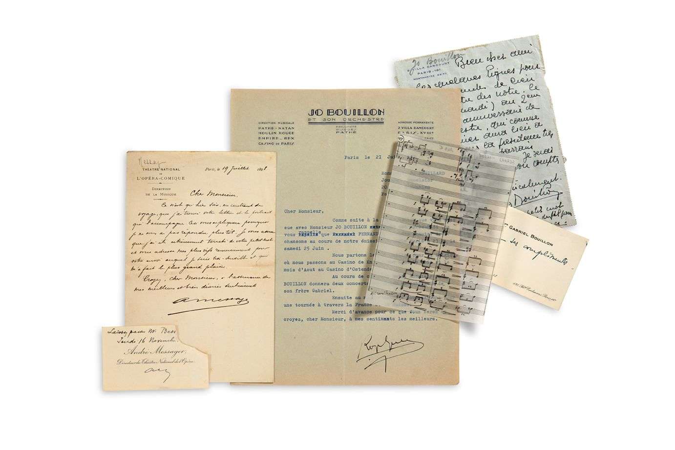 Jo BOUILLON : à Gabriel Reuillard pour venir au « 2ème déjeuner anniversaire de mon orchestre », [14.V.1938] (plus une lettre en son nom à son en-tête et une carte de visite).