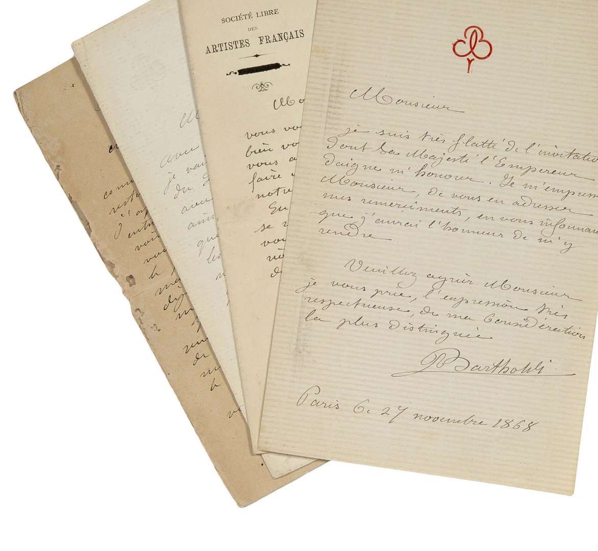 5 L.A.S. «Bartholdi», Paris 1868 - 1903, à Georges LAFENESTRE | 7 pages in-8 (3 à son monogramme).