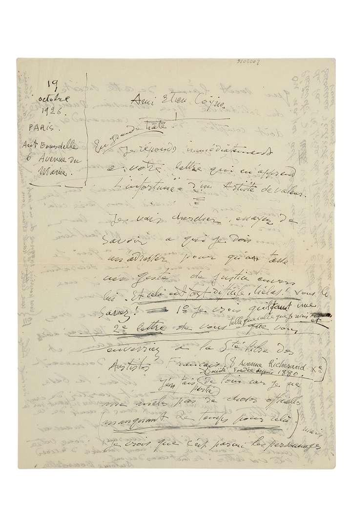 L.A.S. «Ant. Bourdelle», Paris 19 octobre 1926, à Etienne Coÿne | 2 pages in-4 et 1 page et demie in-12.