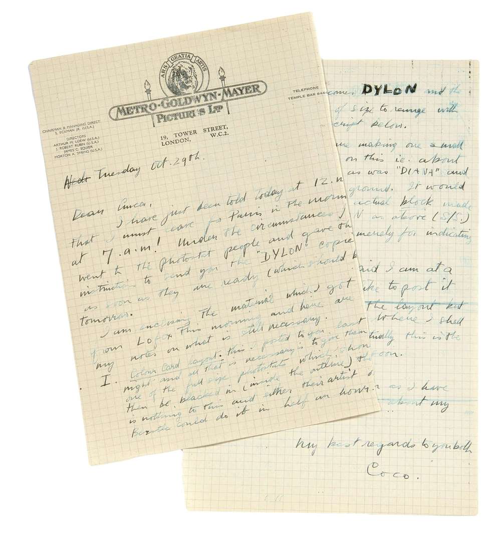 L.A.S.«Coco». Londres 29 octobre [1946], à «Dear Cusca» | 2 pages petit in-fol., la première à en-tête et vignette Metro-Goldwin-Mayer