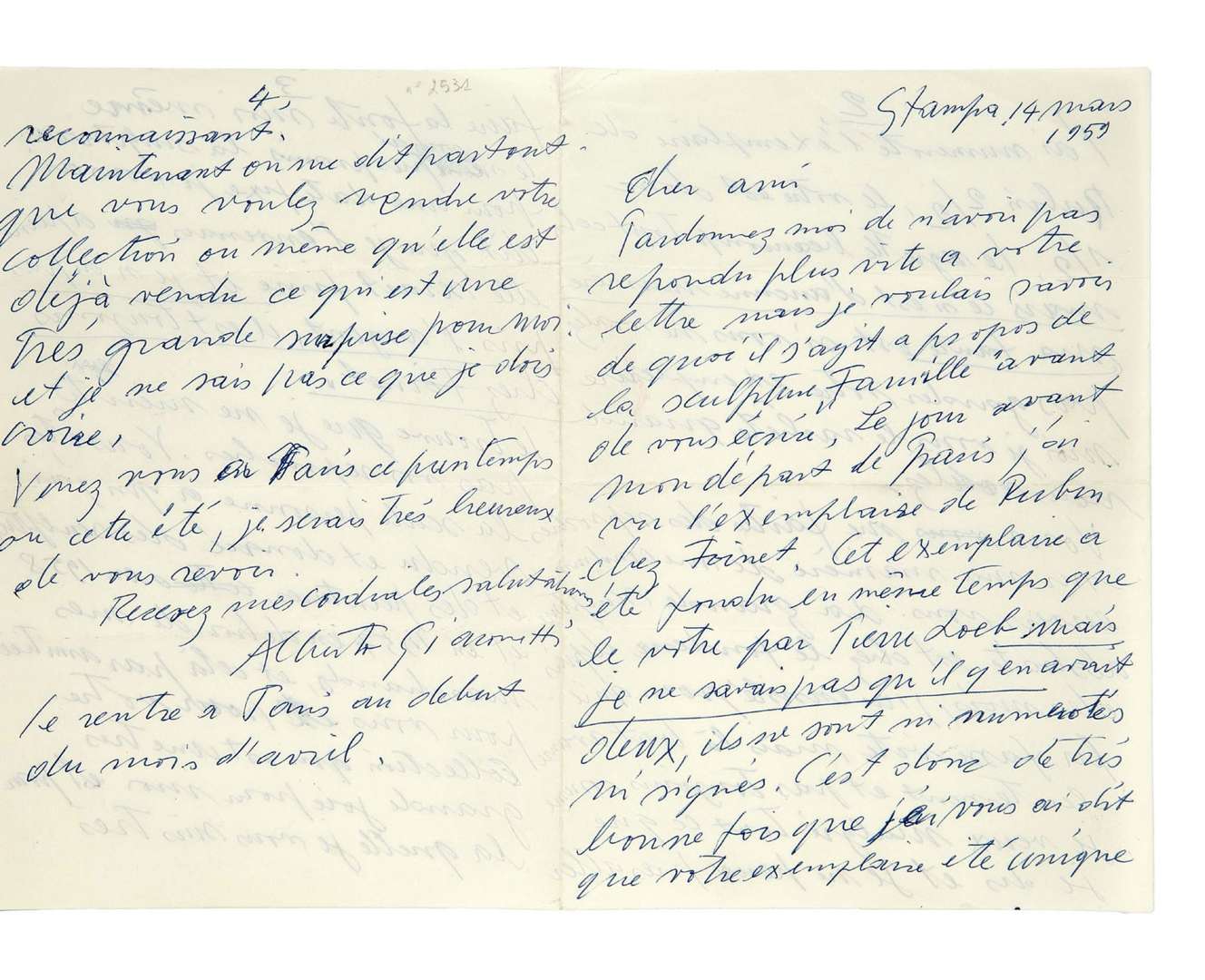 Il ne mérite pas les reproches que Thompson lui adresse : «Vous êtes la seule personne à qui j'ai vendu et donné des scupltures et des peintures, en 1958 et en 1957 en dehor de mes marchands, et cela par amitié pour vous et votre collection qui est une très grande joie pour moi et pour laquelle je vous suis très reconnaissant». Il se dit surpris par la rumeur selon laquelle son correspondant cherche à vendre ou aurait déjà vendu sa collection, et ne sait que croire...