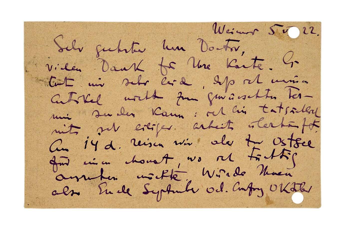 Il se réjouit de son appréciation de son article. Il va partit pour l'Ostsee (la mer Baltique) pour un mois, où il va tâcher de ses reposer, et sera de retour fin septembre ou début octobre...