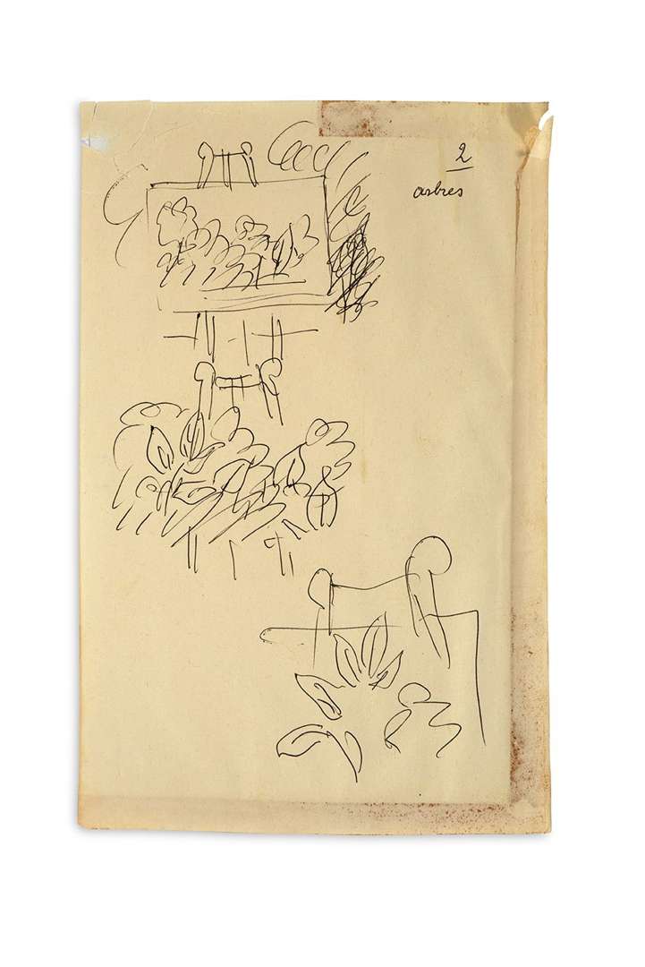 DESSIN original, avec légende autographe : «2/ arbres» | stylo bille noir, 20,5 x 13,5 cm (traces de scotch sur les bords).