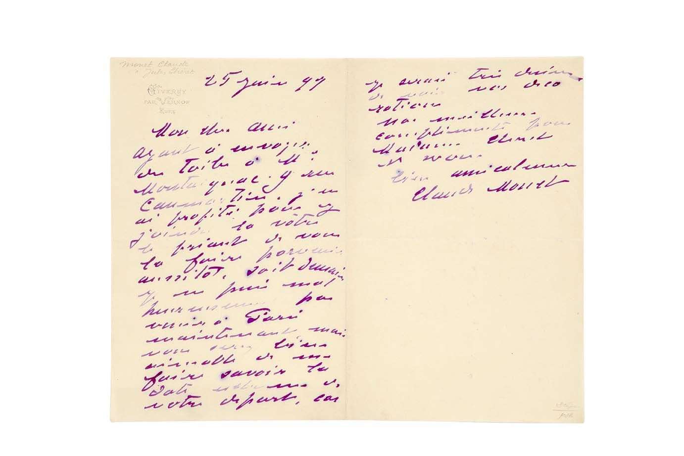 L.A.S. «Claude Monet», Giverny 25 juin 1897, à Jules CHÉRET | 1 page et demie in-8 à en-tête de Giverny.