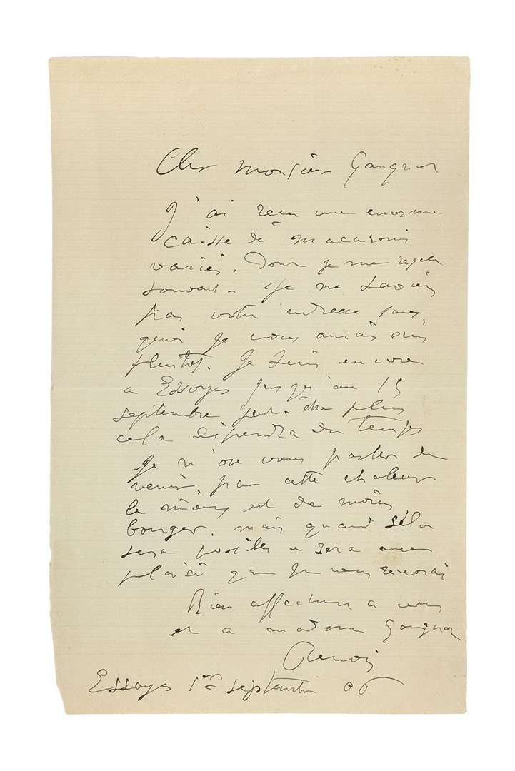Il a «reçu une énorme caisse de macarons variés dont je me régale souvent. Je ne savais pas votre adresse sans quoi je vous aurais écrit plus tôt. Je suis encore à Essoyes jusqu'au 15 septembre, peut-être plus, cela dépendra du temps. Je n'ose vous parler de venir par cette chaleur, le mieux est de moins bouger mais quand cela sera possible ce sera avec plaisir que je vous reverrai»...