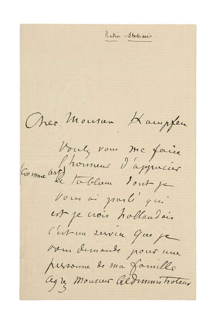 L.A.S. «A. Rodin», 26 juin 1896, à Albert KAEMPFEN, «administrateur du Louvre» | 1 page et demie in-8.