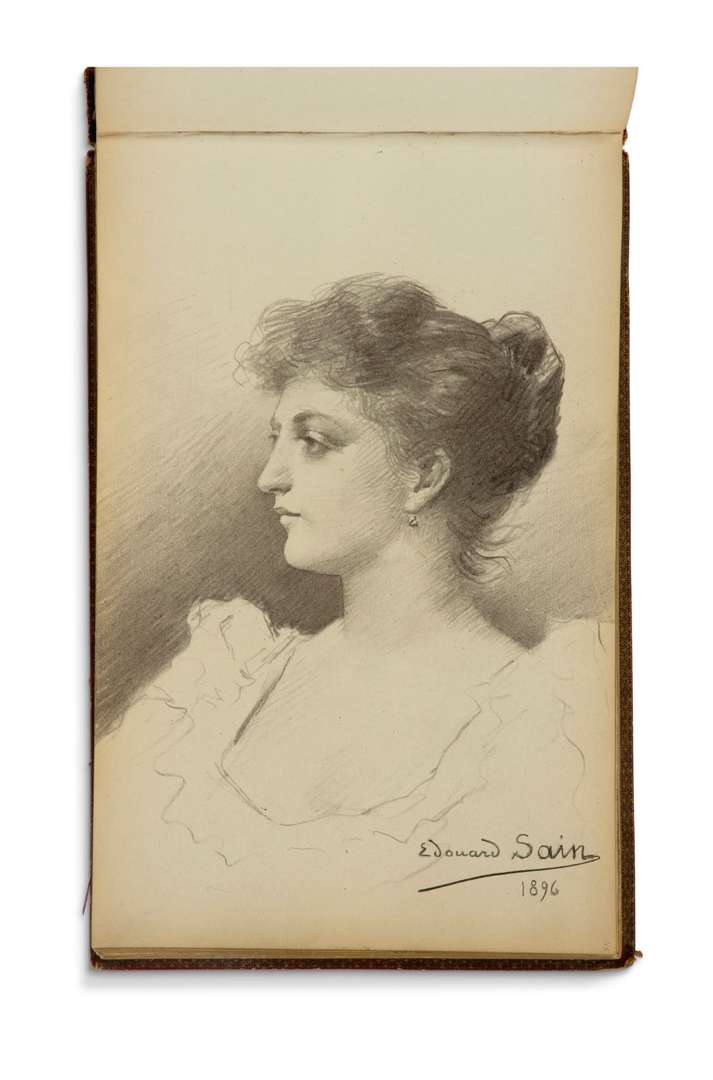 ALBUM AMICORUM ALBUM de Mlle Léontine CHAMPION, avec MUSIQUES et pensées autographes signées, et DESSINS, 1880-1915 | album oblong petit in-4 (17,5 x 27 cm) de 85 feuillets, reliure chagrin rouge, encadrement doré sur les plats avec le titre AUTOGRAPHES en lettres dorées sur le plat sup., tanches dorées.
