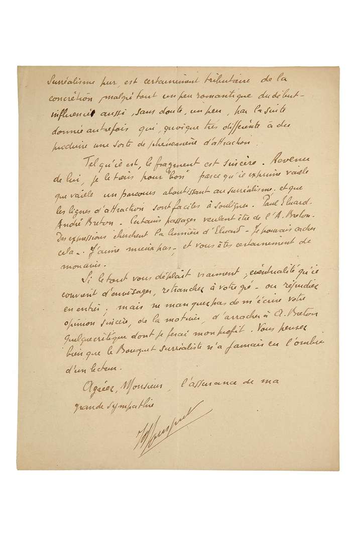 Il a retravaillé avec «une expression nouvelle et différente» la première partie. «La suite, où je n'ai pas voulu, par honnêteté littéraire, masquer des influences détestables, ni d'autres que je bénis, me semble, si je m'en rapporte au souvenir que j'ai gardé des crises qui me tenaient alors tourner autour d'idées soufflées par votre groupe, que je gagnais à la lecture des exercices d'ÉLUARD, mais que le manifeste d'A. BRETON devait m'imposer. Ainsi, le Surréalisme de la dernière partie, tout en étant du Surréalisme pur, est certainement tributaire de la concrétion, malgré tout un peu romantique, du début [...]. Tel qu'il est, le fragment est sincère. [...] je le tiens pour “bon” parce qu'il exprime vaille que vaille un parcours aboutissant au Surréalisme, et que les lignes d'attraction sont faciles à souligner. Paul Éluard, André Breton. Certains passages veulent être de l'A. Breton, des expressions cherchent la lumière d'Éluard- Je pouvais cacher cela, mais j'aime mieux pas»... Il prie de lui écrire sa sincère opinion, et «d'arracher à A. Breton quelque critique dont je ferai mon profit. Vous pensez bien que le Bousquet Surréaliste n'a jamais eu l'ombre d'un lecteur»...
