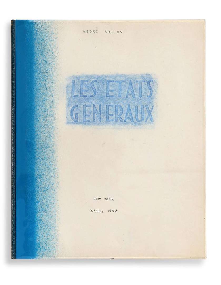 MANUSCRIT autographe signé « André Breton », LES ÉTATS GÉNÉRAUX, 1943 | titre et 6 feuillets in-4 (21,5 x 27,9 cm) écrits au recto, l'ensemble monté sur onglets, et relié : dos de maroquin bleu nuit à la Bradel portant le titre en grandes lettres à l'œser blanc, et le nom de l'auteur, le lieu et la date en lettres dorées, plats de plexiglas transparent, peint sur le premier d'une bande verticale dégradée bleu ciel en bord intérieur et, sur le second, contrecollé d'une carte de même teinte unie, étui bordé (Mercher, 1966).