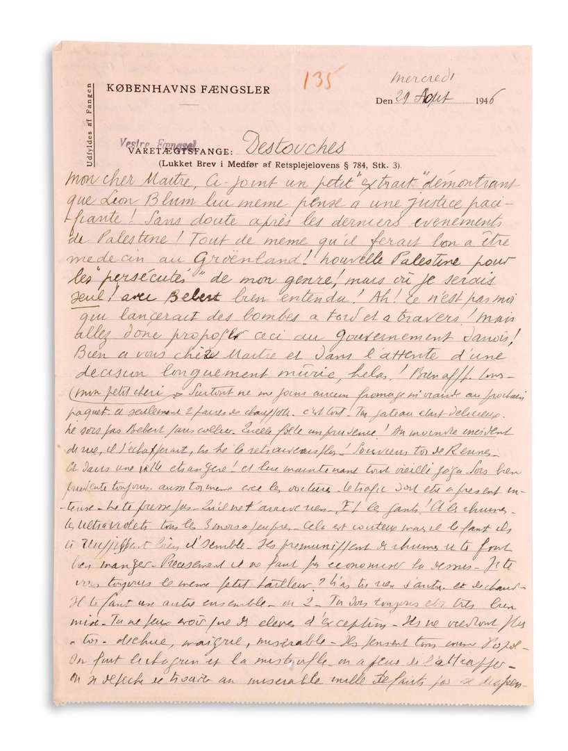Mercredi 29 août 1946, à son avocat danois Thorvald MIKKELSEN et à SA FEMME LUCETTE DESTOUCHES | 2 pages grand in-4 sur papier rose à en-tête de la prison Københavns Fængsler.