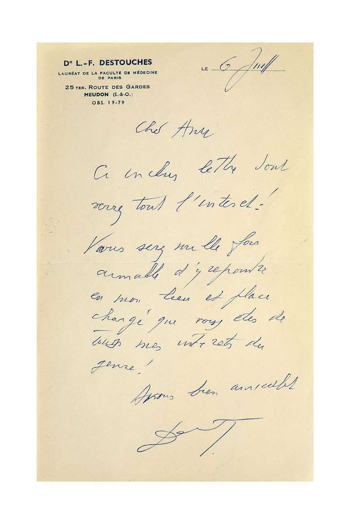 L.A.S. «Destouches», Meudon 6 juillet [1957], à Paul CHAMBRILLON | 1 page in-8 à son en-tête Dr L.-F. Destouches Lauréat de la Faculté de Médecine de Paris, enveloppe.